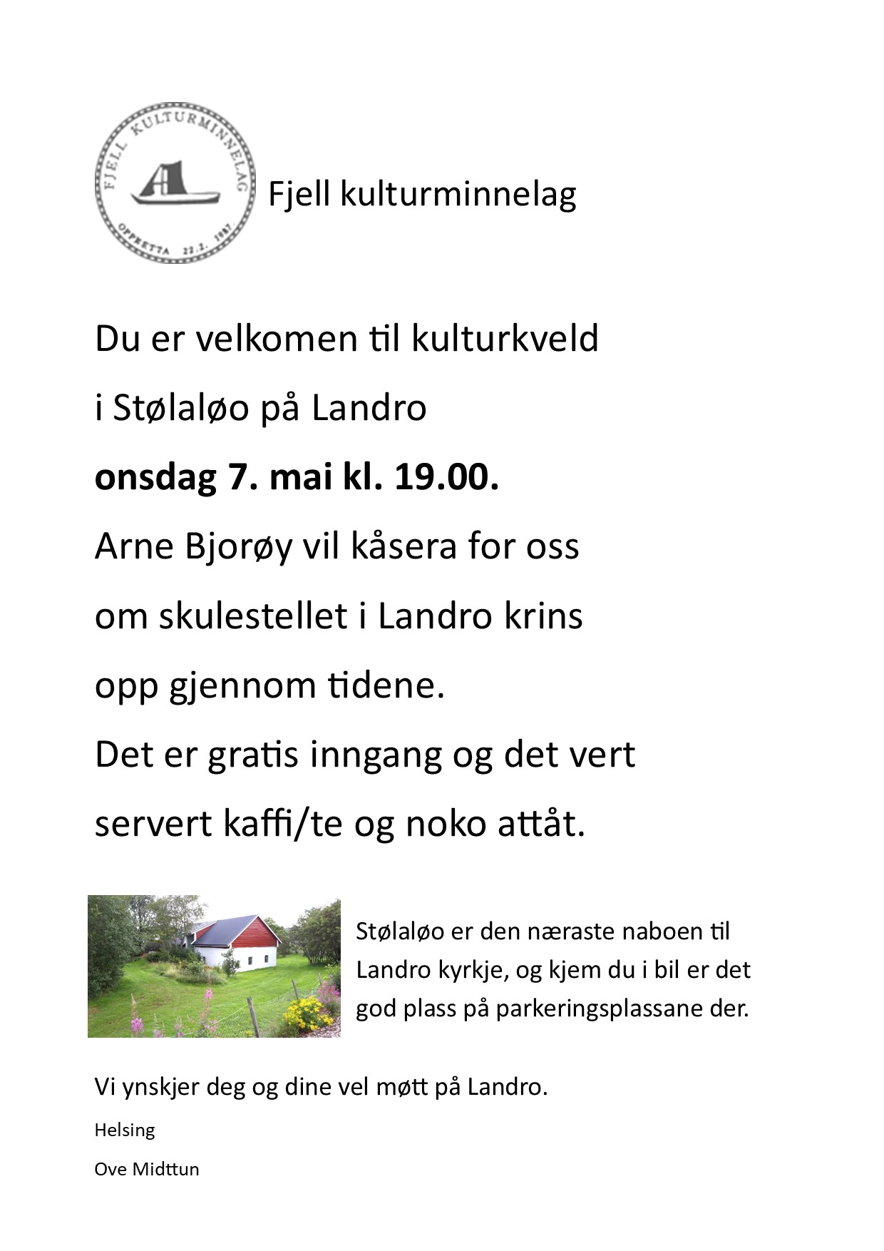 Kulturkvel 7. mai Du er velkomen til kulturkveld i Stølaløo på Landro onsdag 7. mai kl. 19.00. Les mer