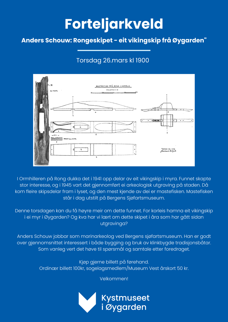 Torsdag 26. mars kl 19 vert det forteljarkveld på Kystmuseet i Ovågen. Det vert kåseri av Anders Schouw frå Sjøfartsmueet om skipsfunnet i Ormhilleren på Rong. Plakaten for møtet følgjer som vedlegg her.